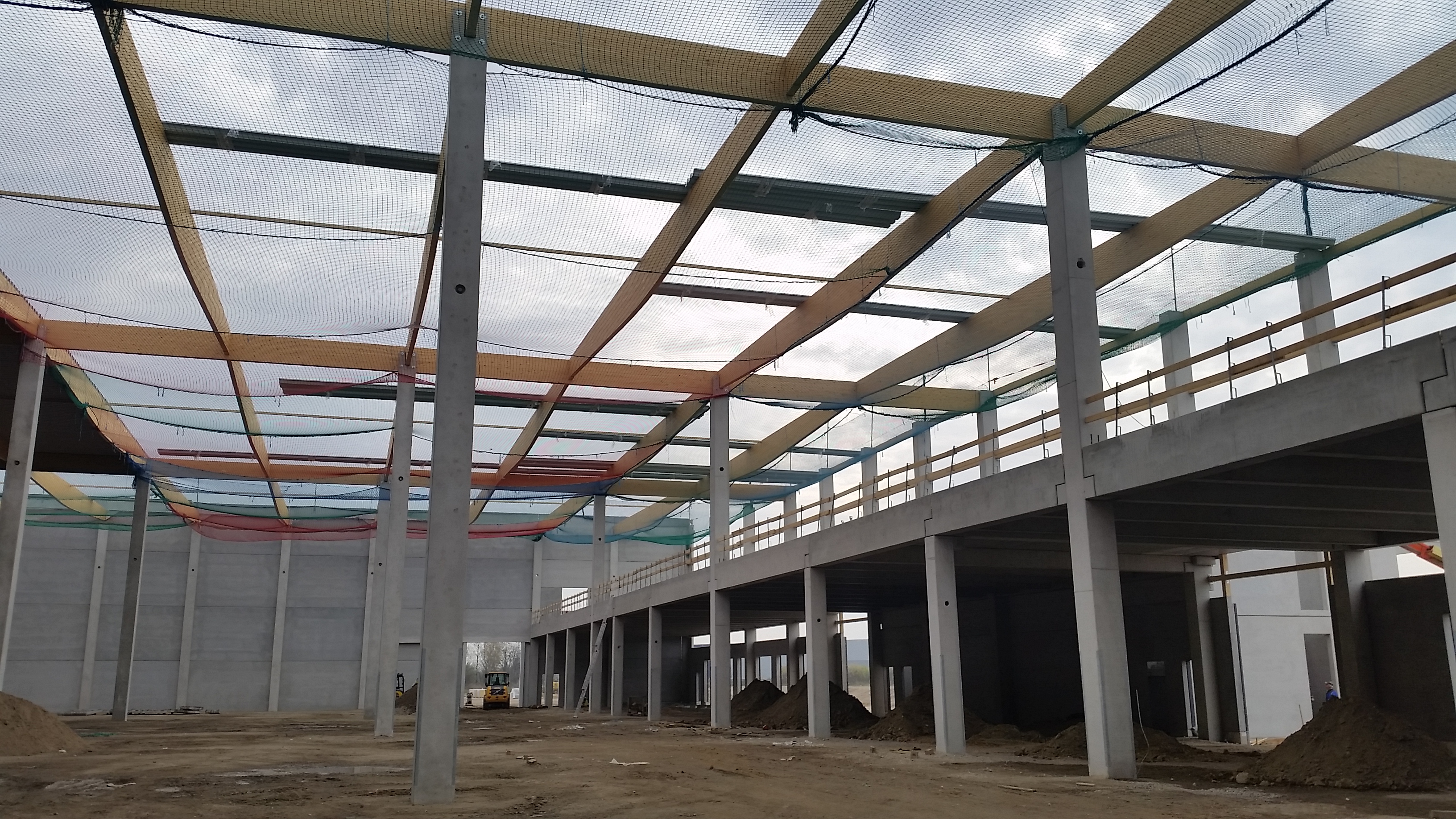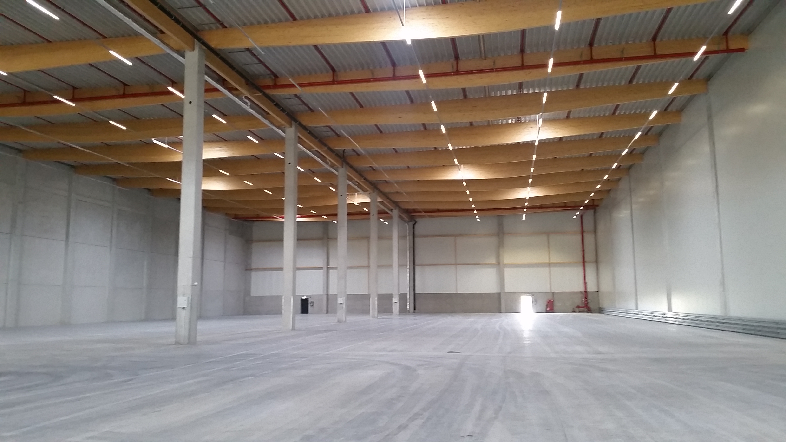 Diese Logistikimmobilie besteht aus einer 16.650 m² großen Lagerhalle und einem Mezzanine-Geschoss für Sozial- und Büroflächen. Die erforderliche Brandwand teilt die Halle in zwei Abschnitte.