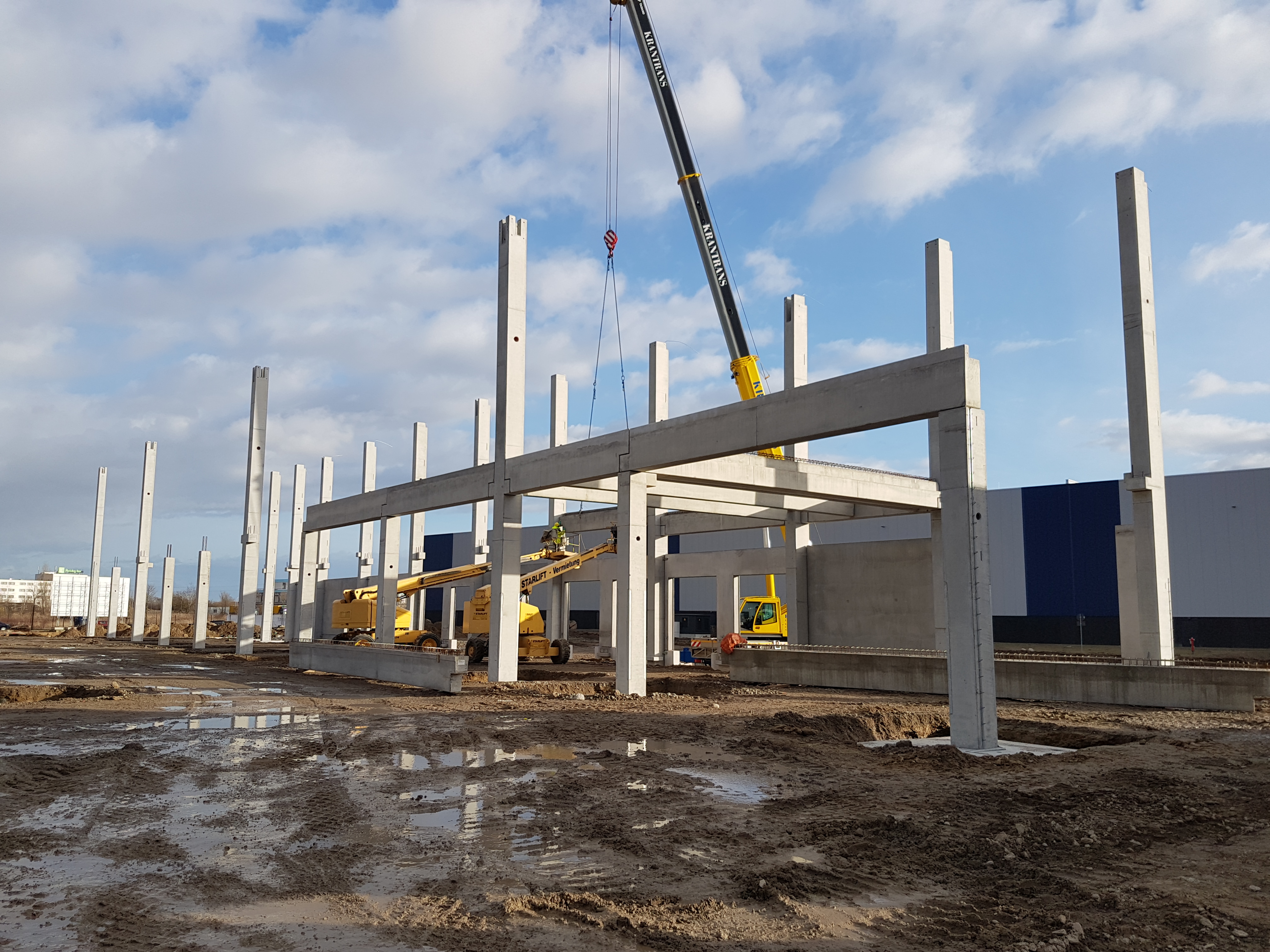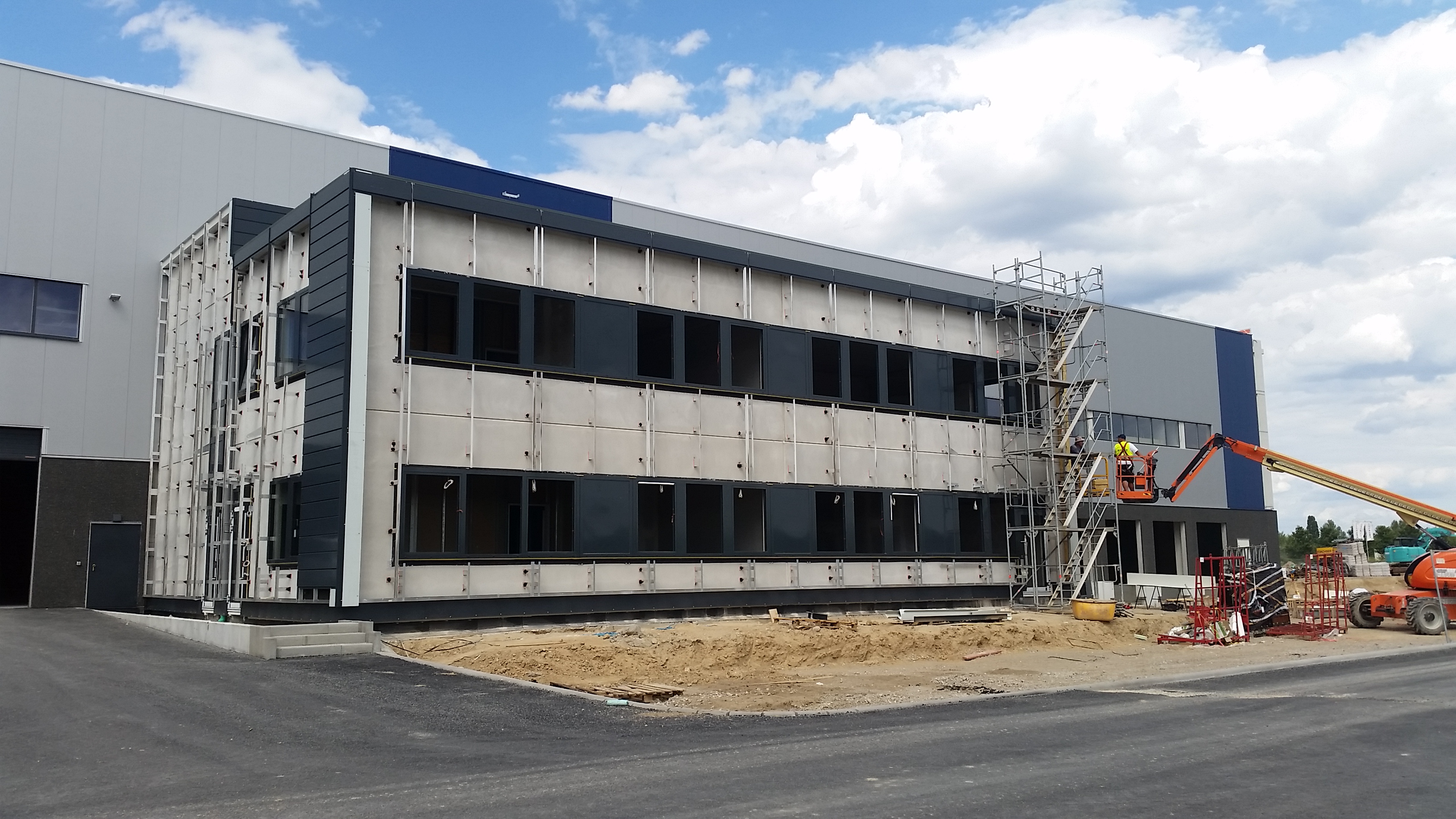 An der Logistikhalle ist ein zweigeschossiges Bürogebäude vorgelagert. Die Konstruktion besteht aus Fertigteilmassivwänden und Spannbetondecken.
