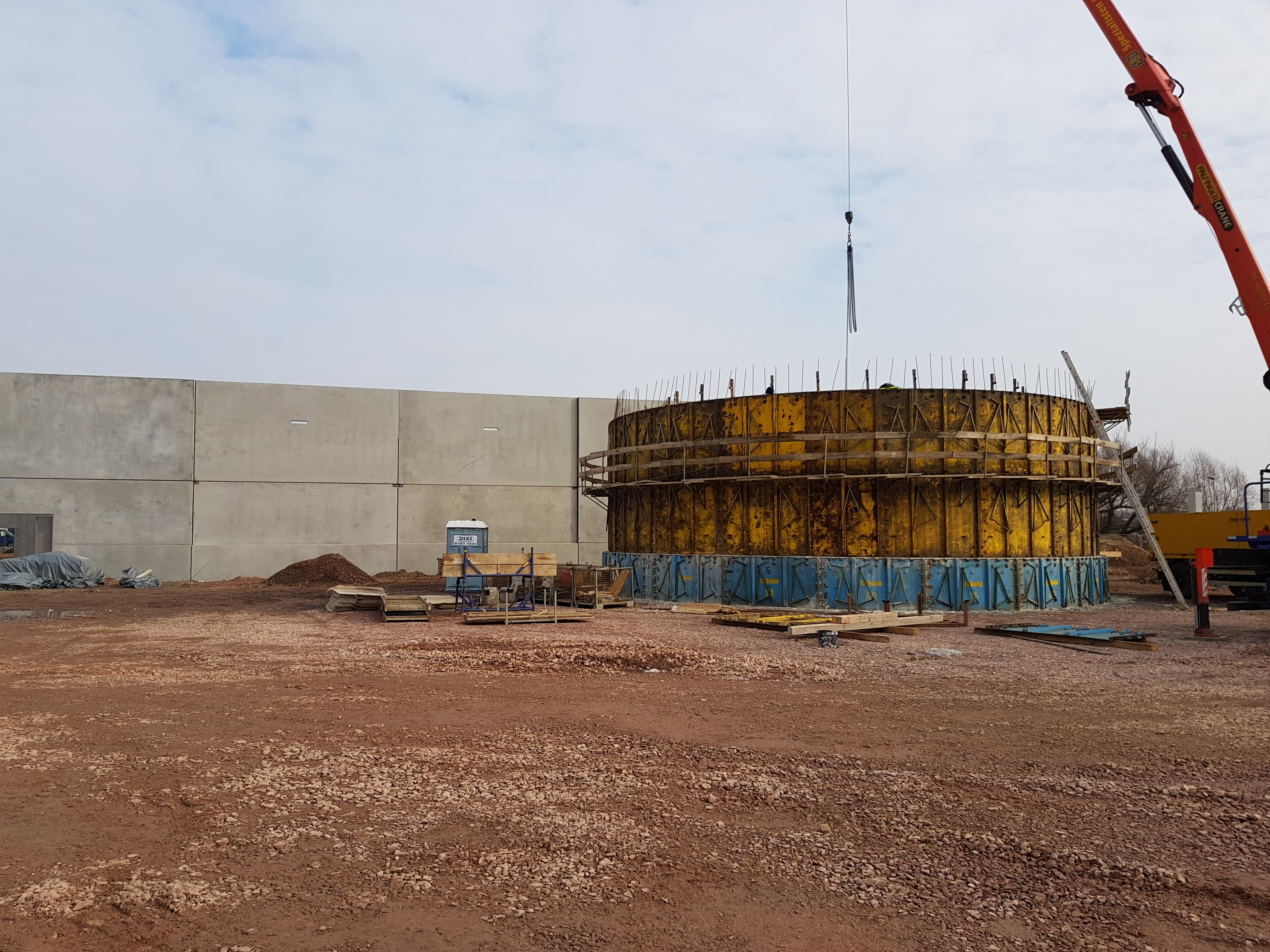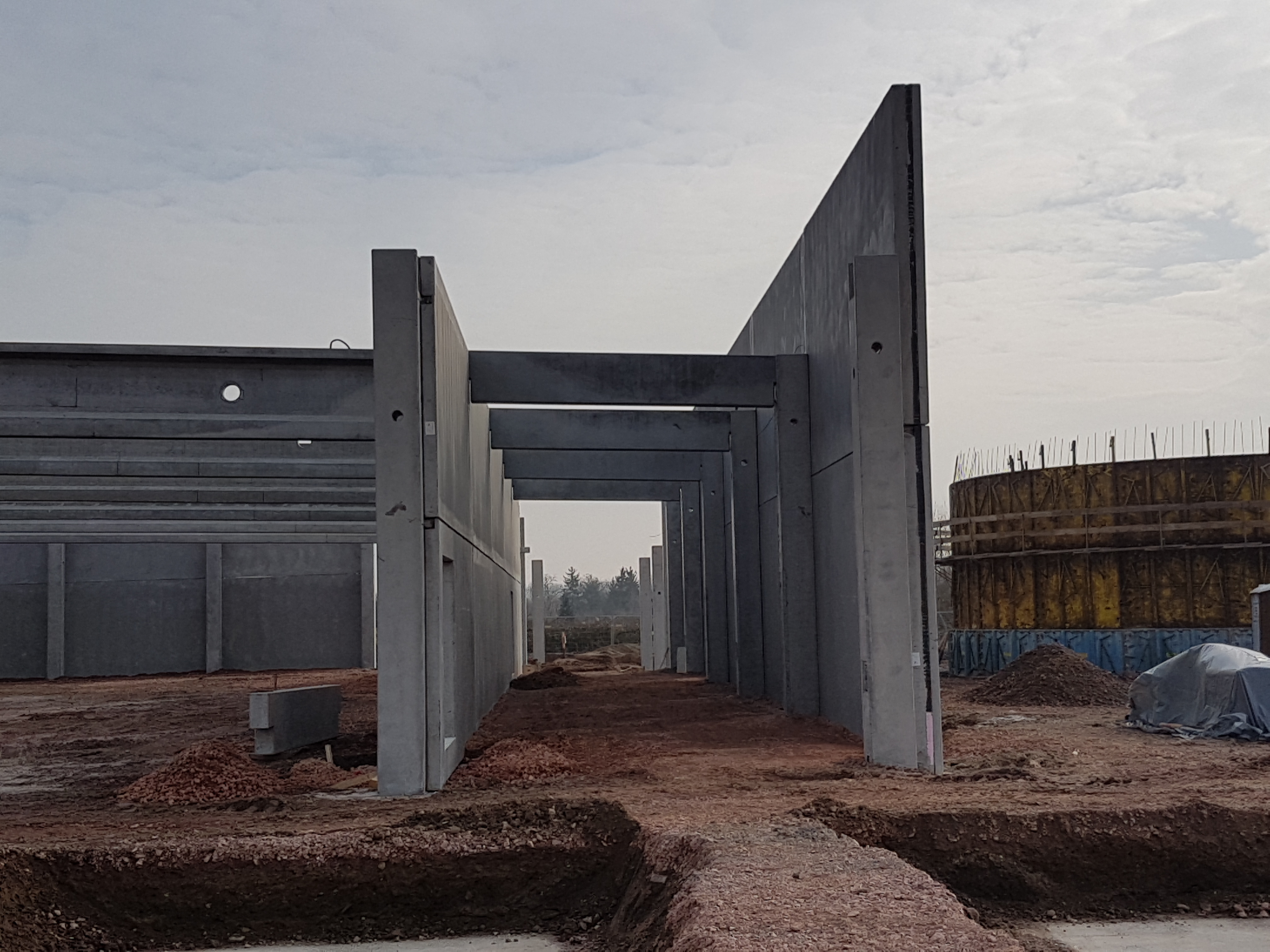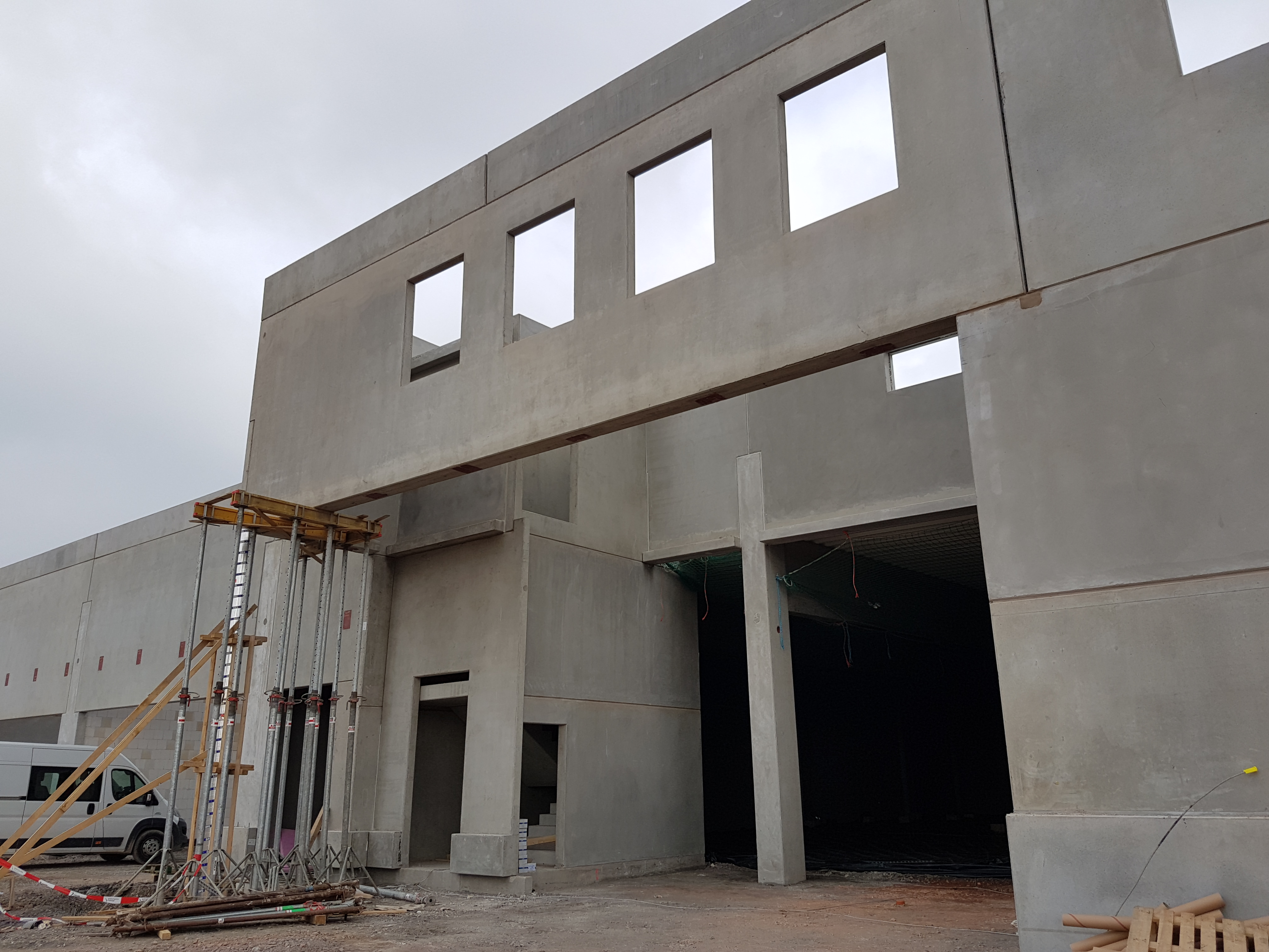 Das Tragwerk besteht aus Fundamentstützen, Spannbetonbindern und umlaufenden Massiv- bzw. Sandwichwänden. Die einzelnen Fachmärkte werden durch massive Brandwandplatten von einander getrennt.
