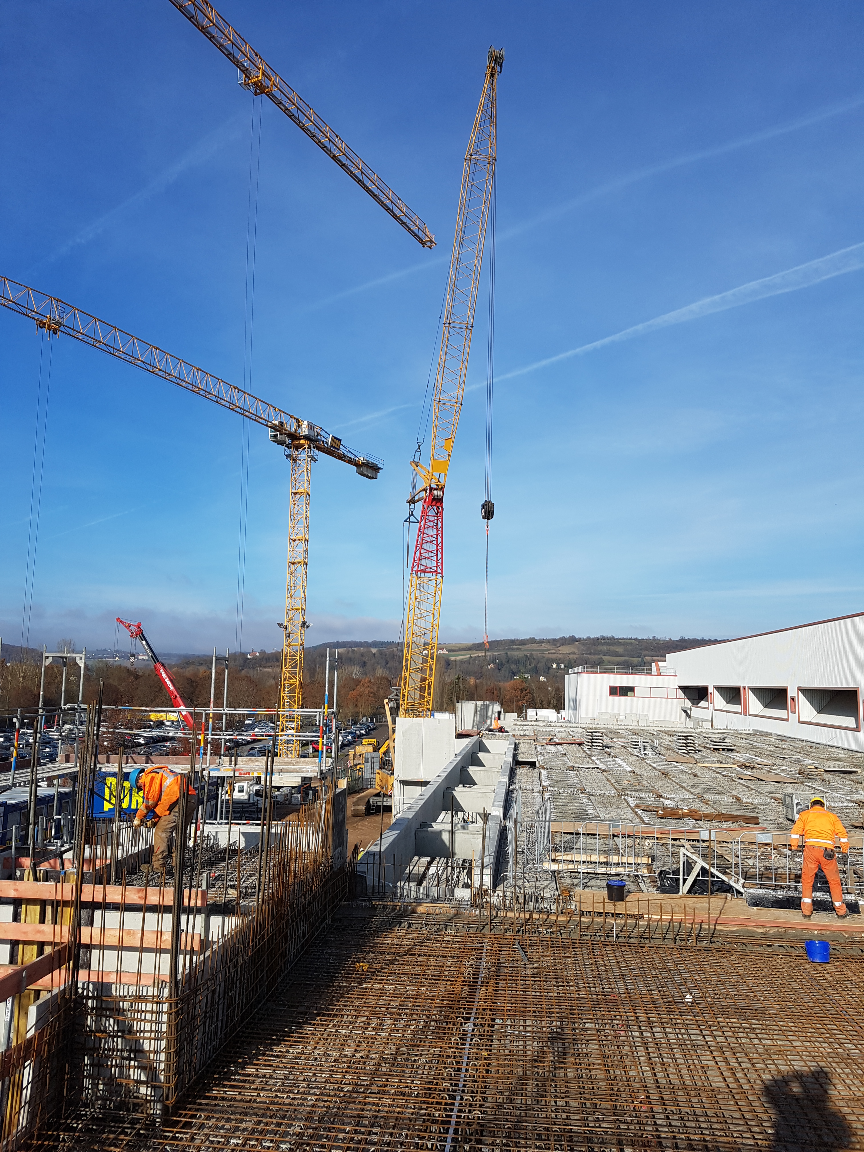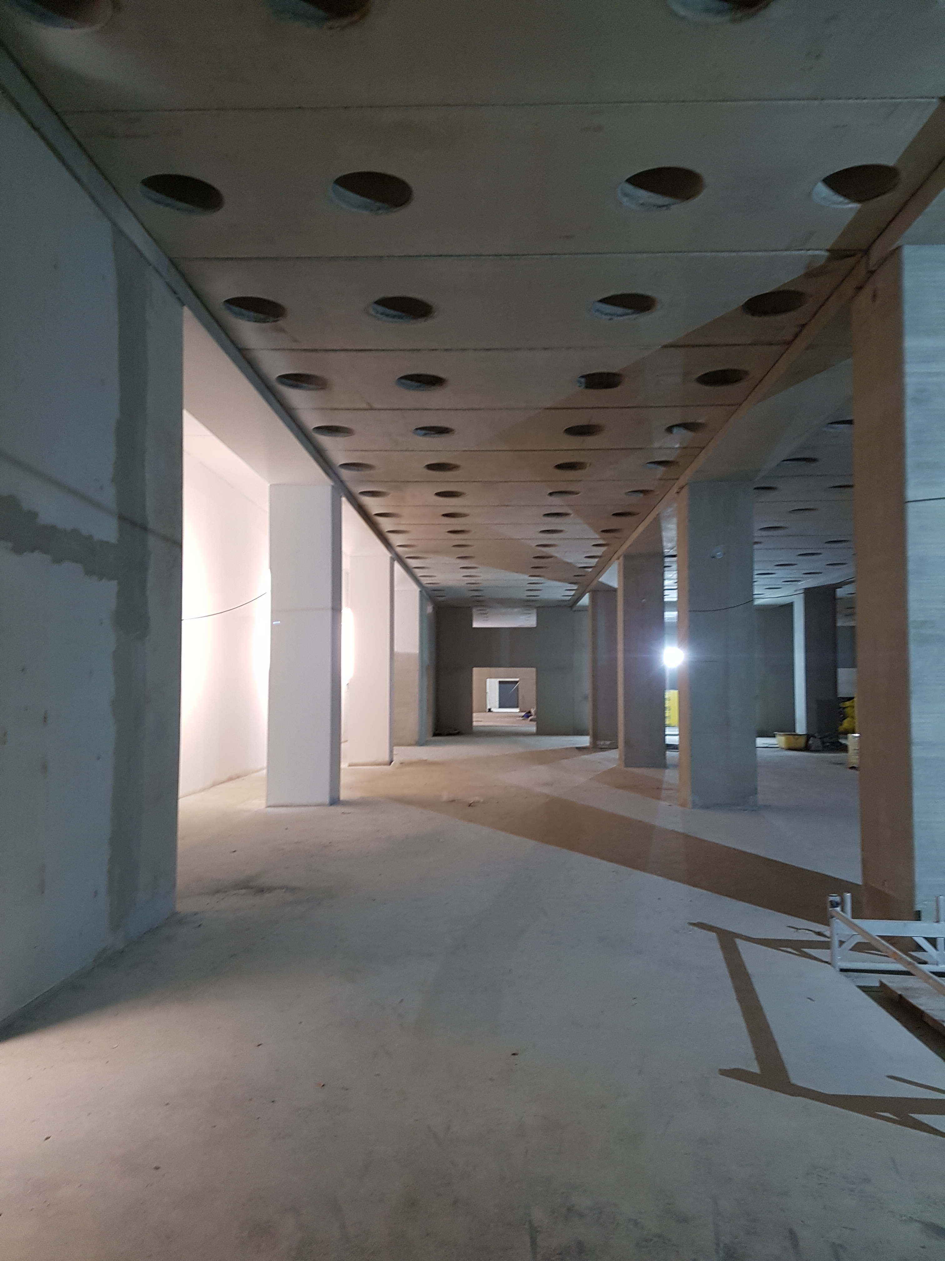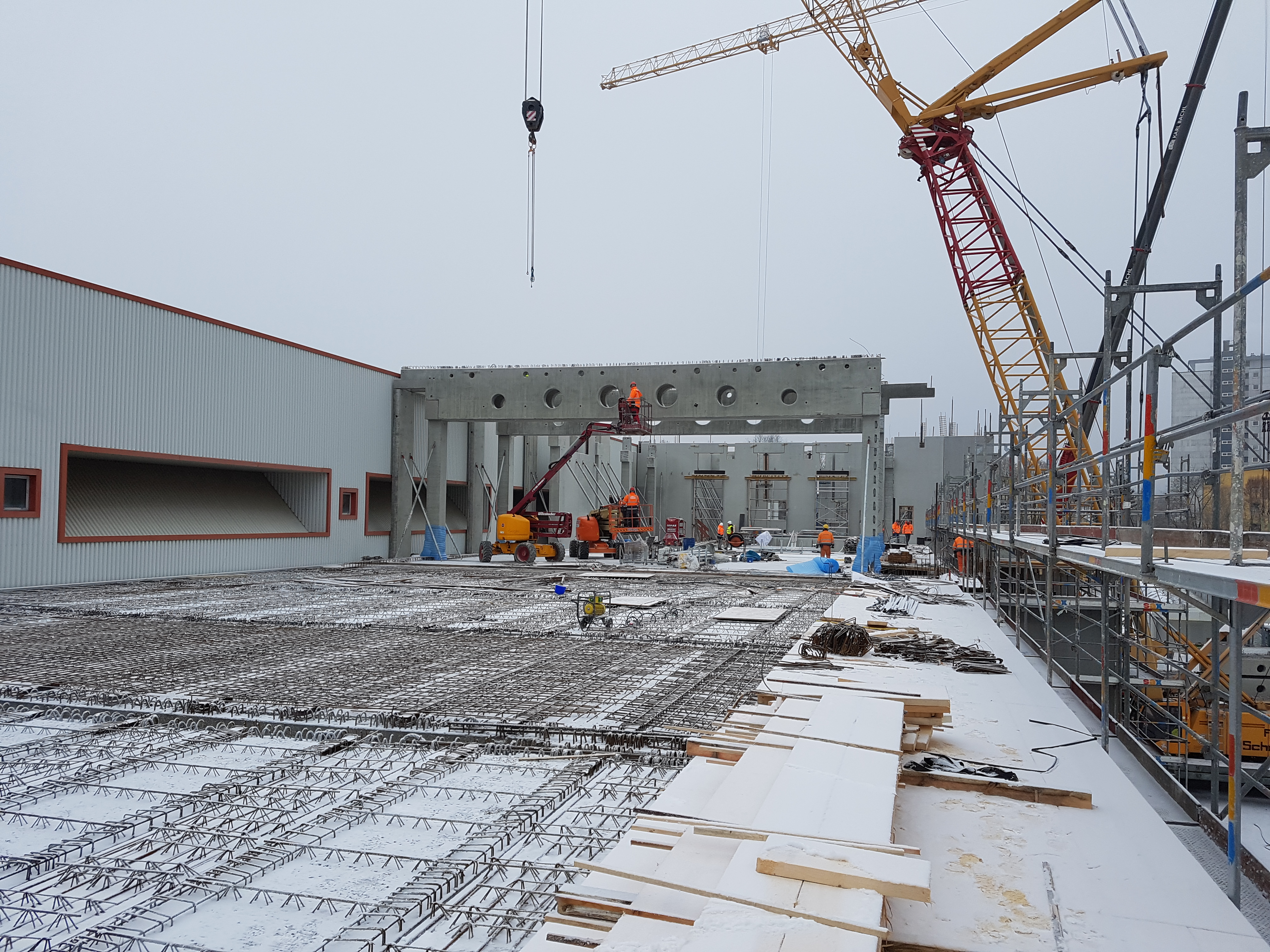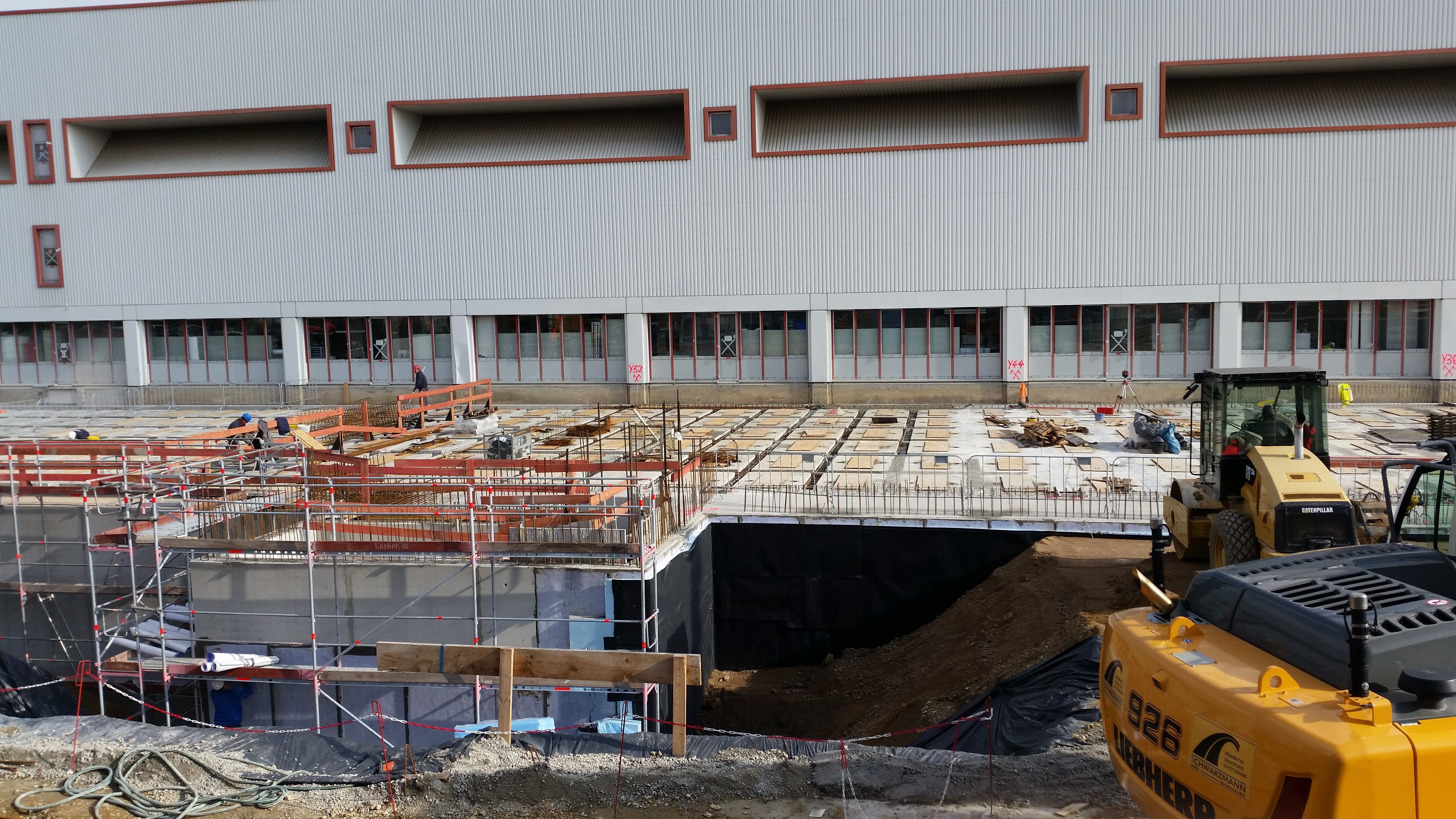 Die seitlichen Kopfbauten als Doppelwandkonstruktion unterschieden sich enorm vom Zwischenbau aus konstruktiven Fertigteilen.