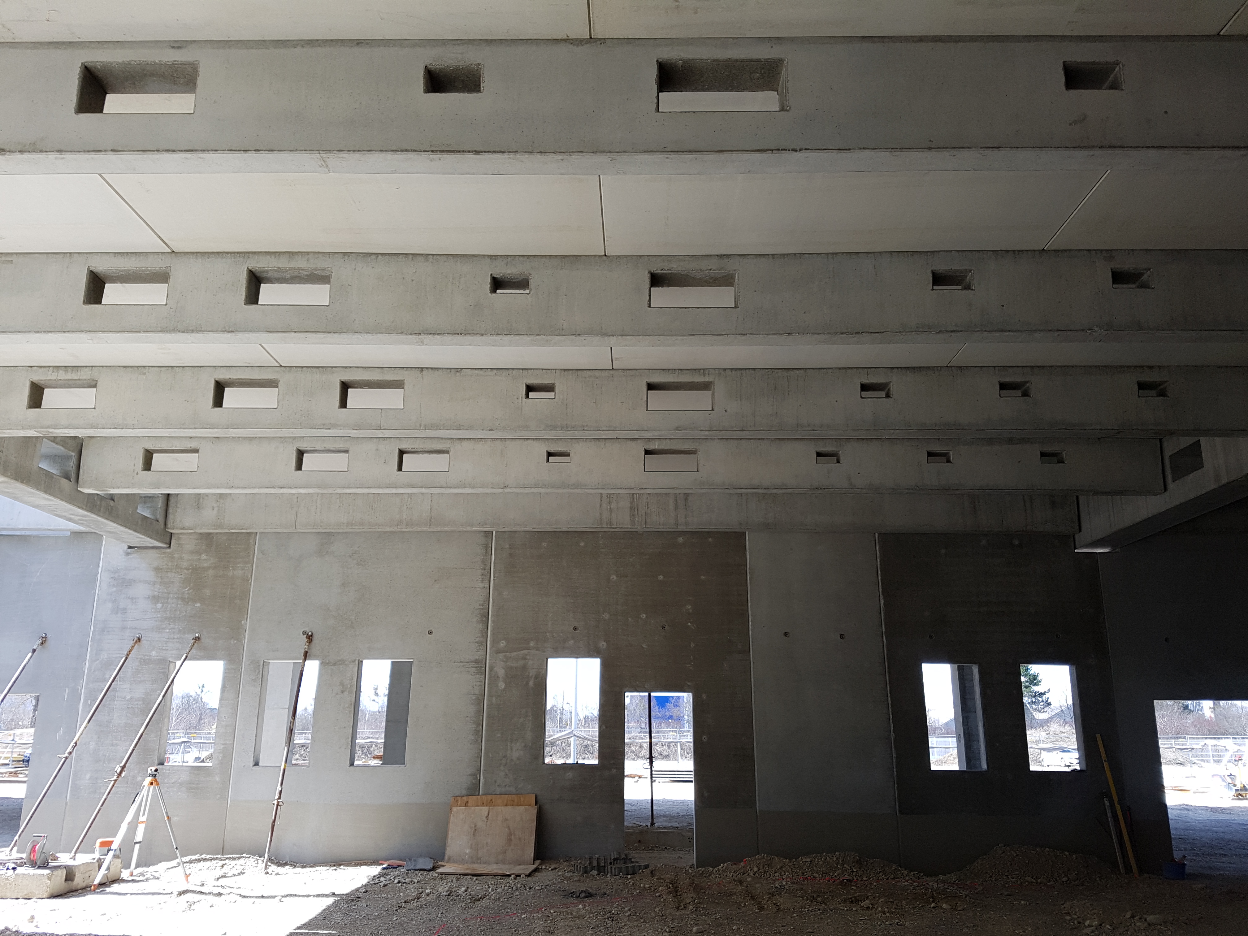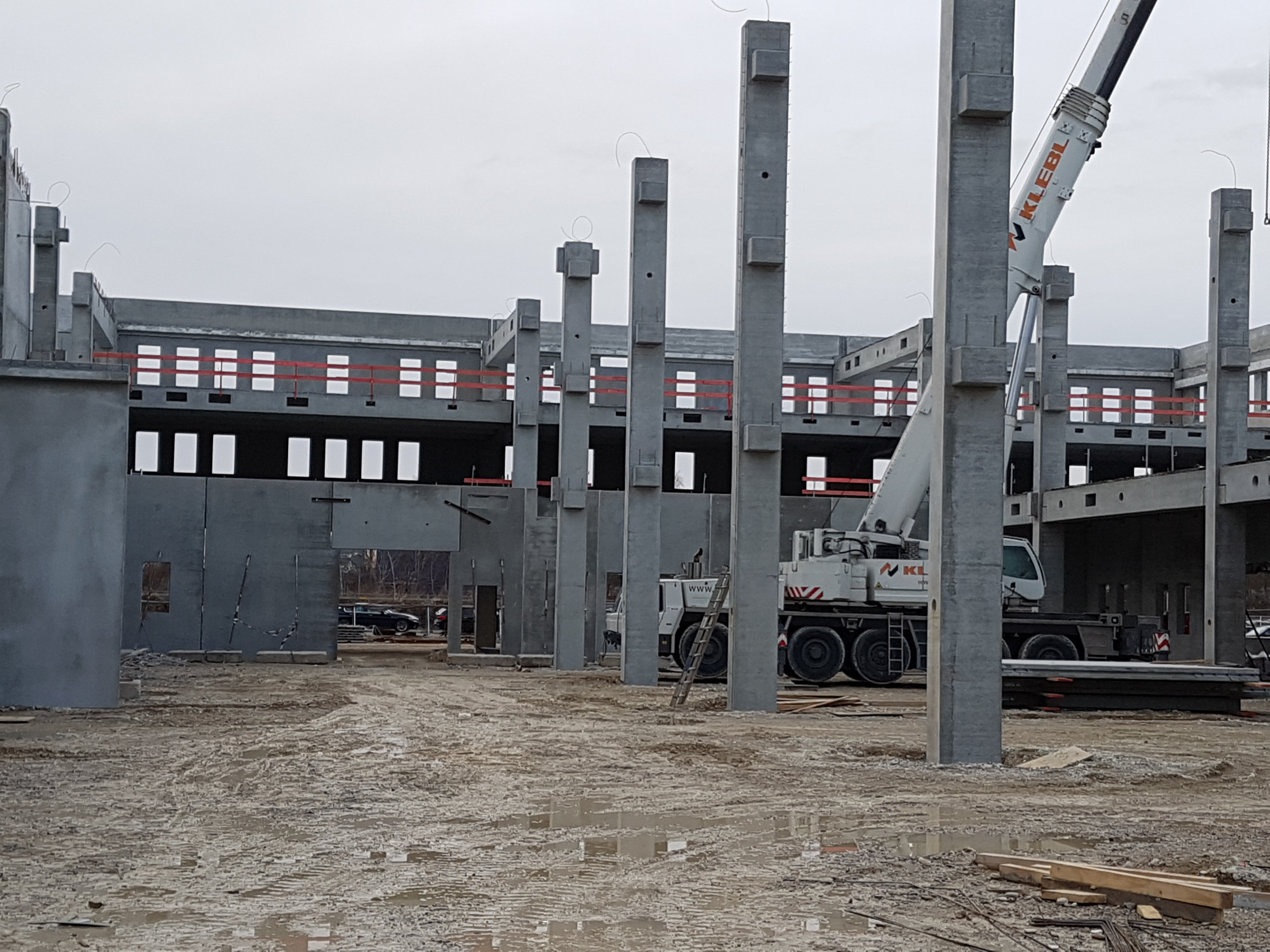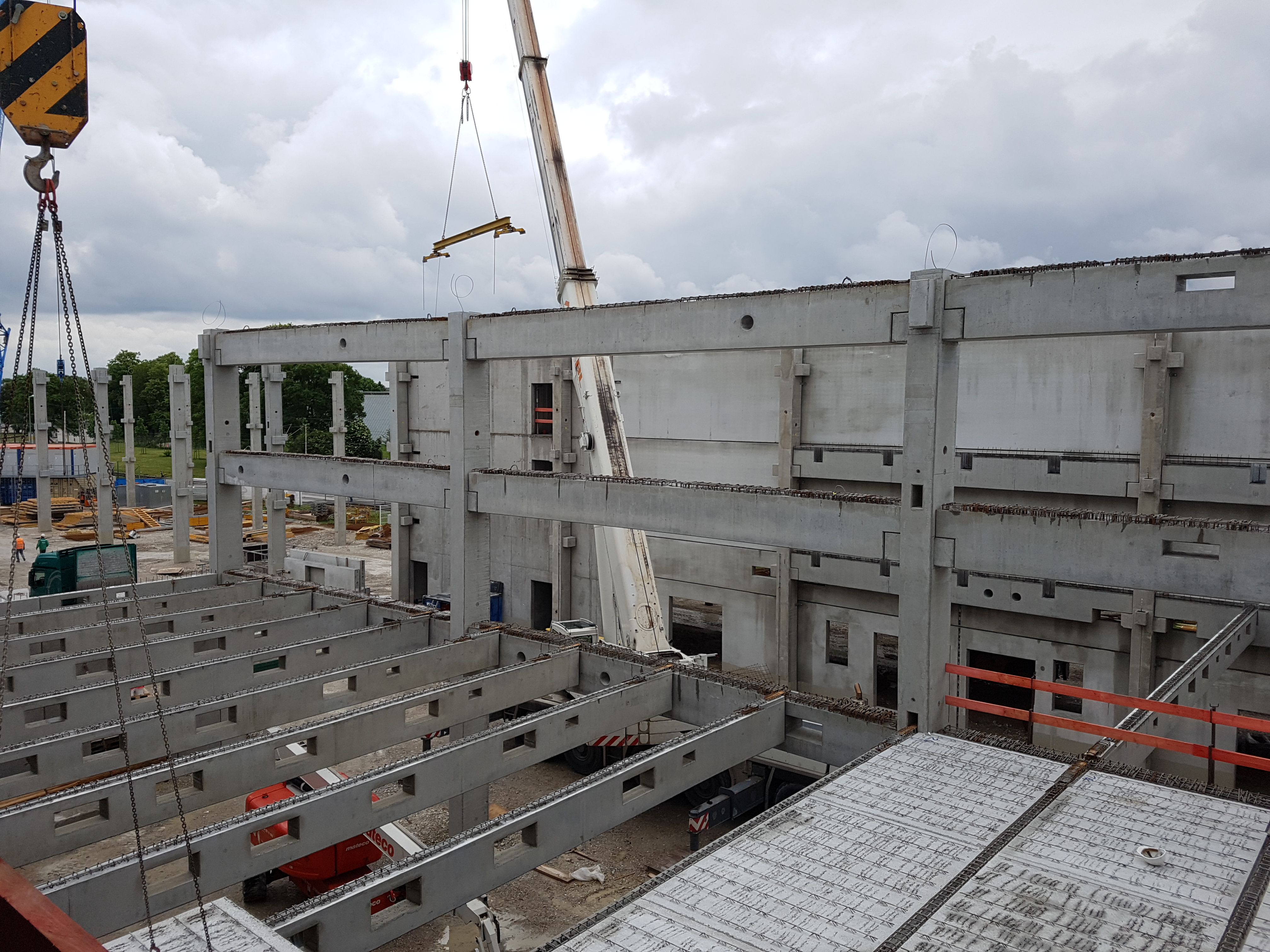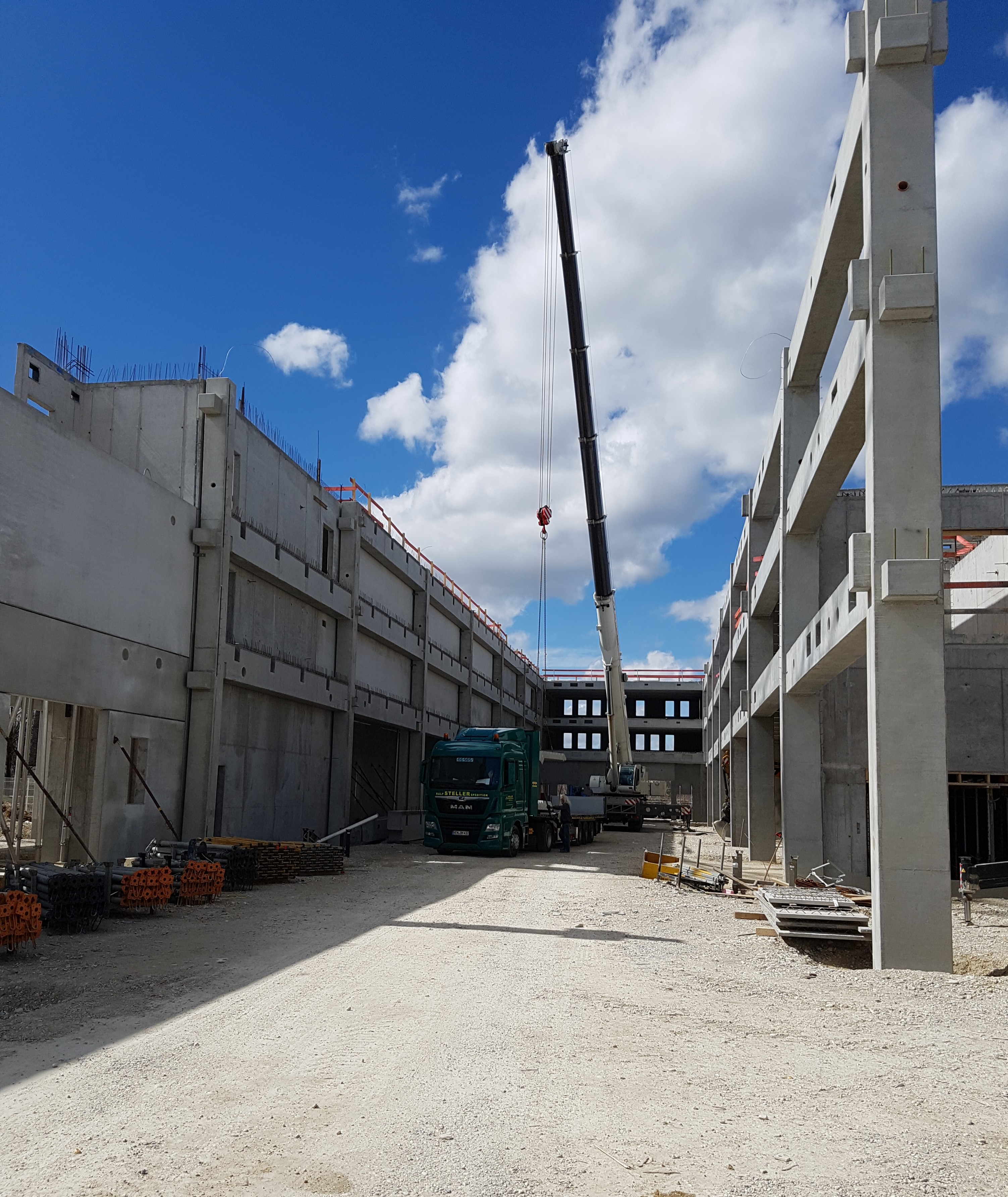 Ergänzt wurde die Fertigteilkonstruktion mit 2 Aufzugschächten für Fahrzeugtransport, 4 Treppenhäusern und einem Rampenbauwerk als Zufahrt zu den einzelnen Parkdecks mit ca. 440 PKW-Stellplätzen.