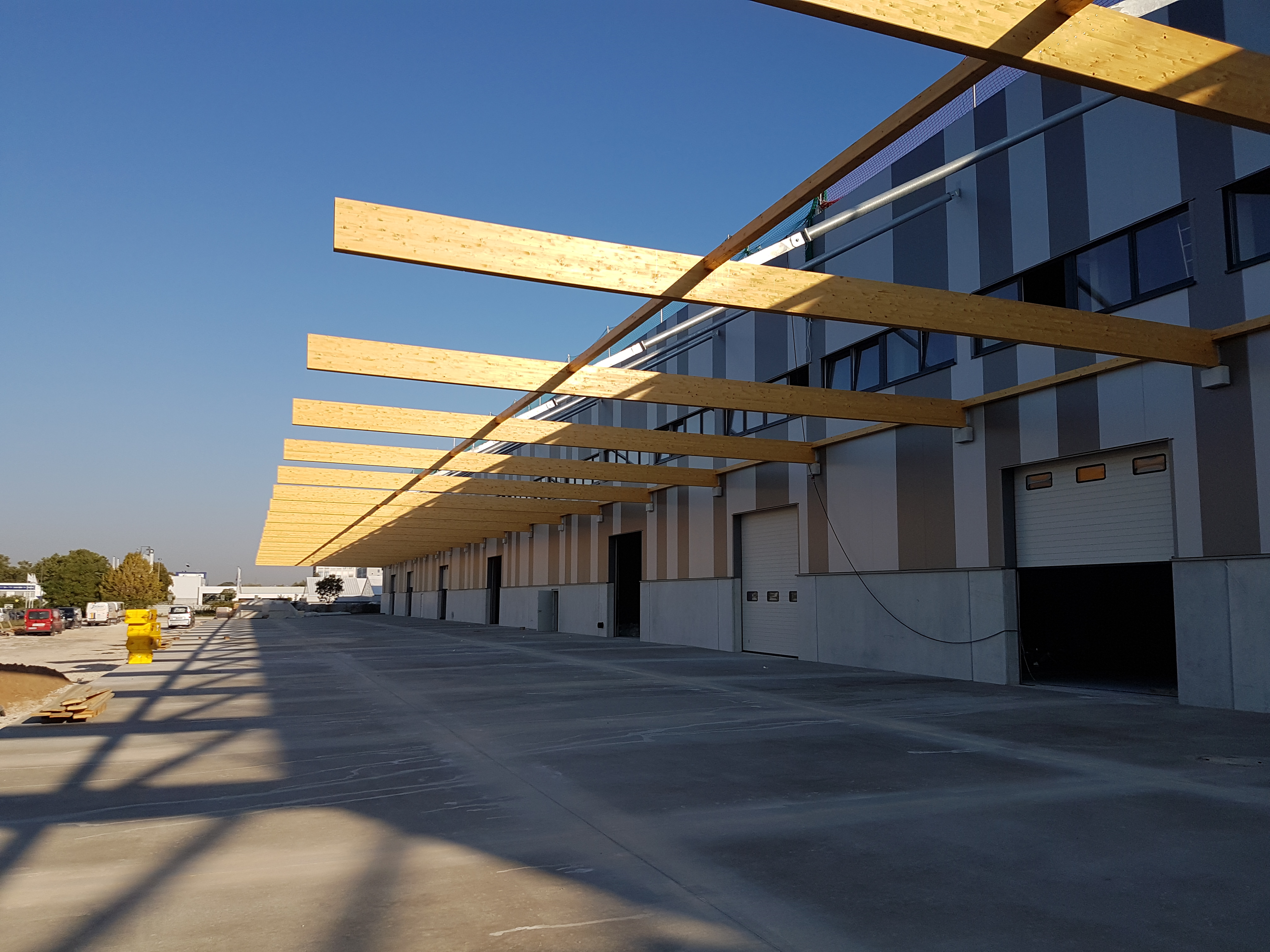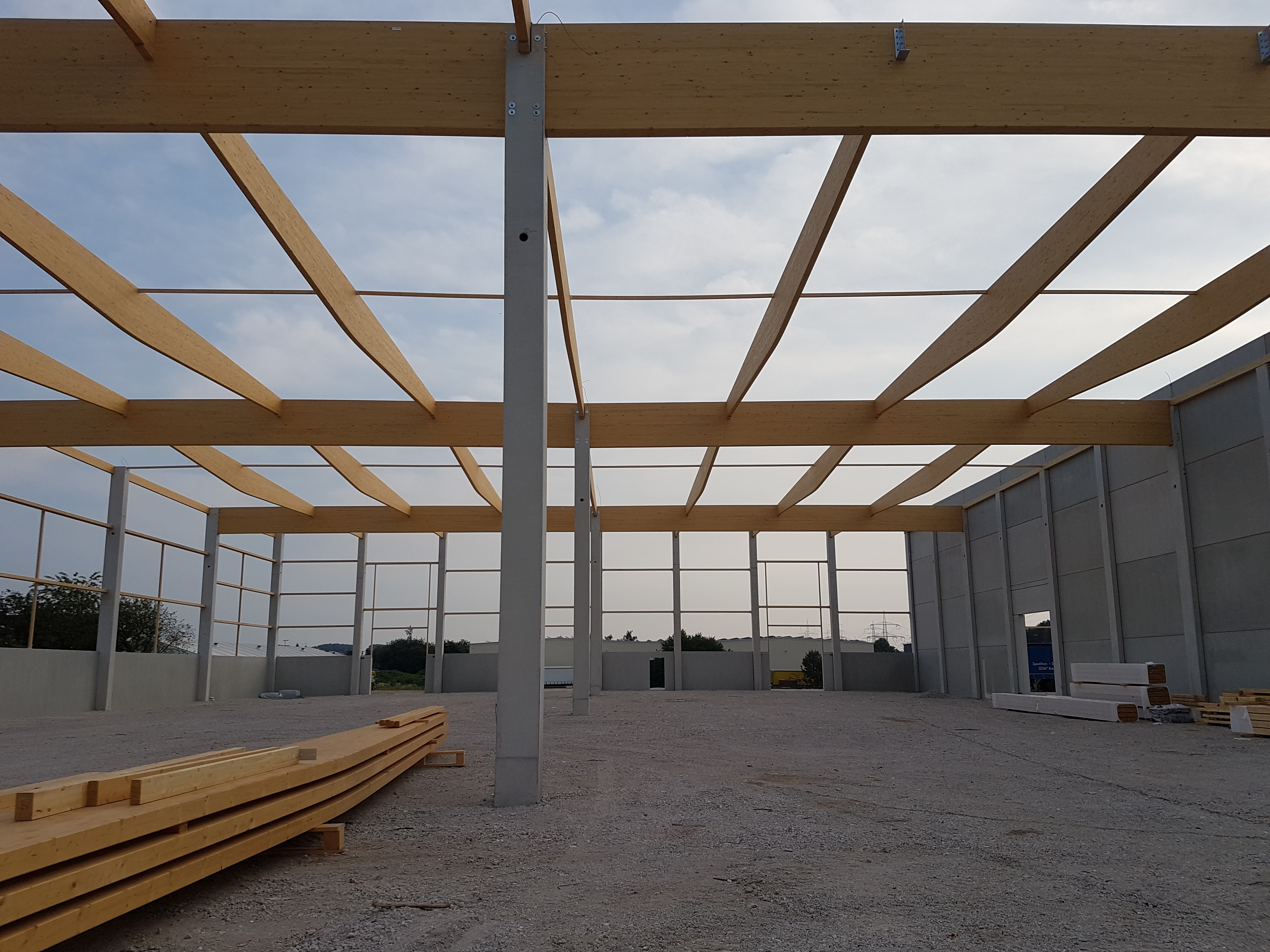 - Vordachträger aus Holz, Länge 15 m freitragend, an Stützen/ Dachtragwerk angeschlossen