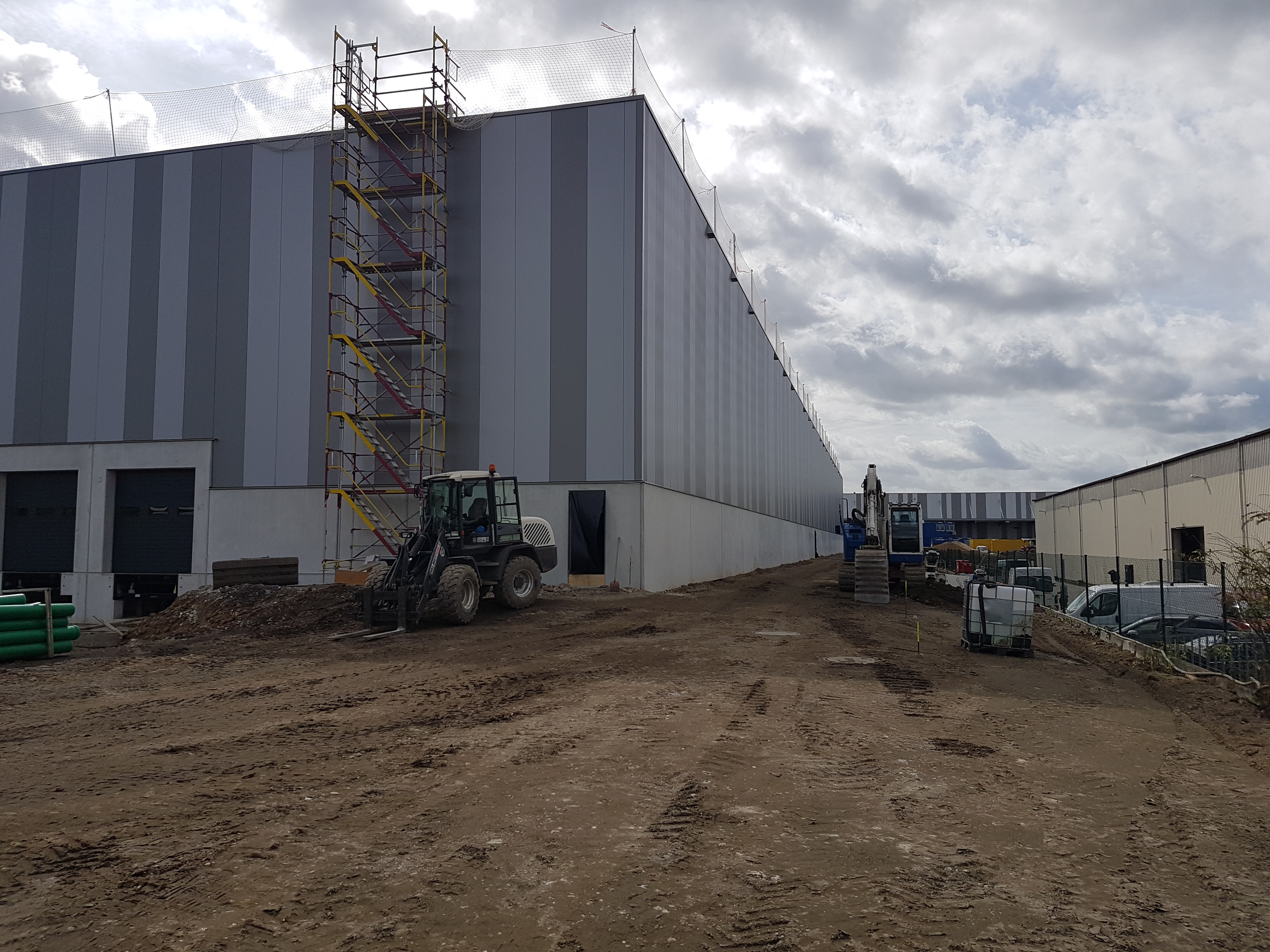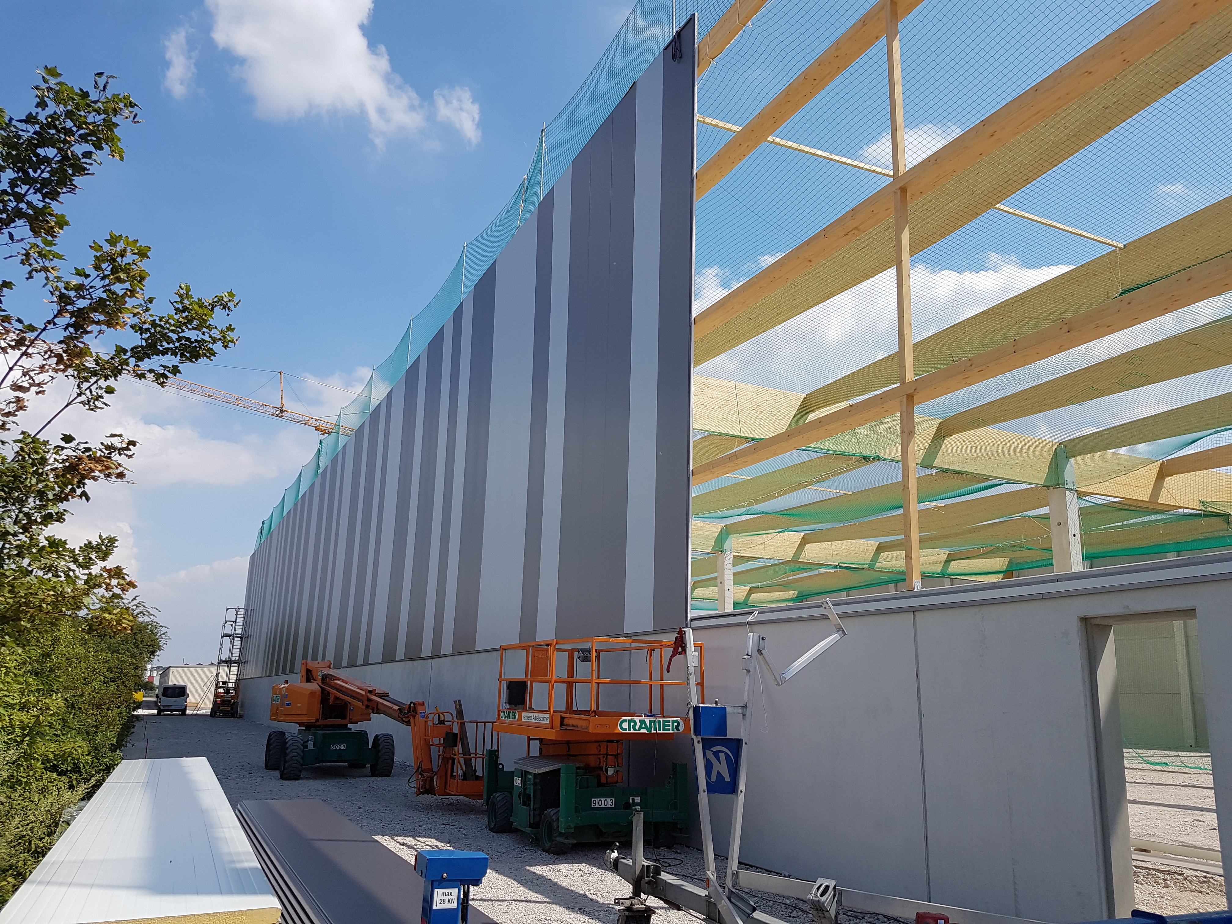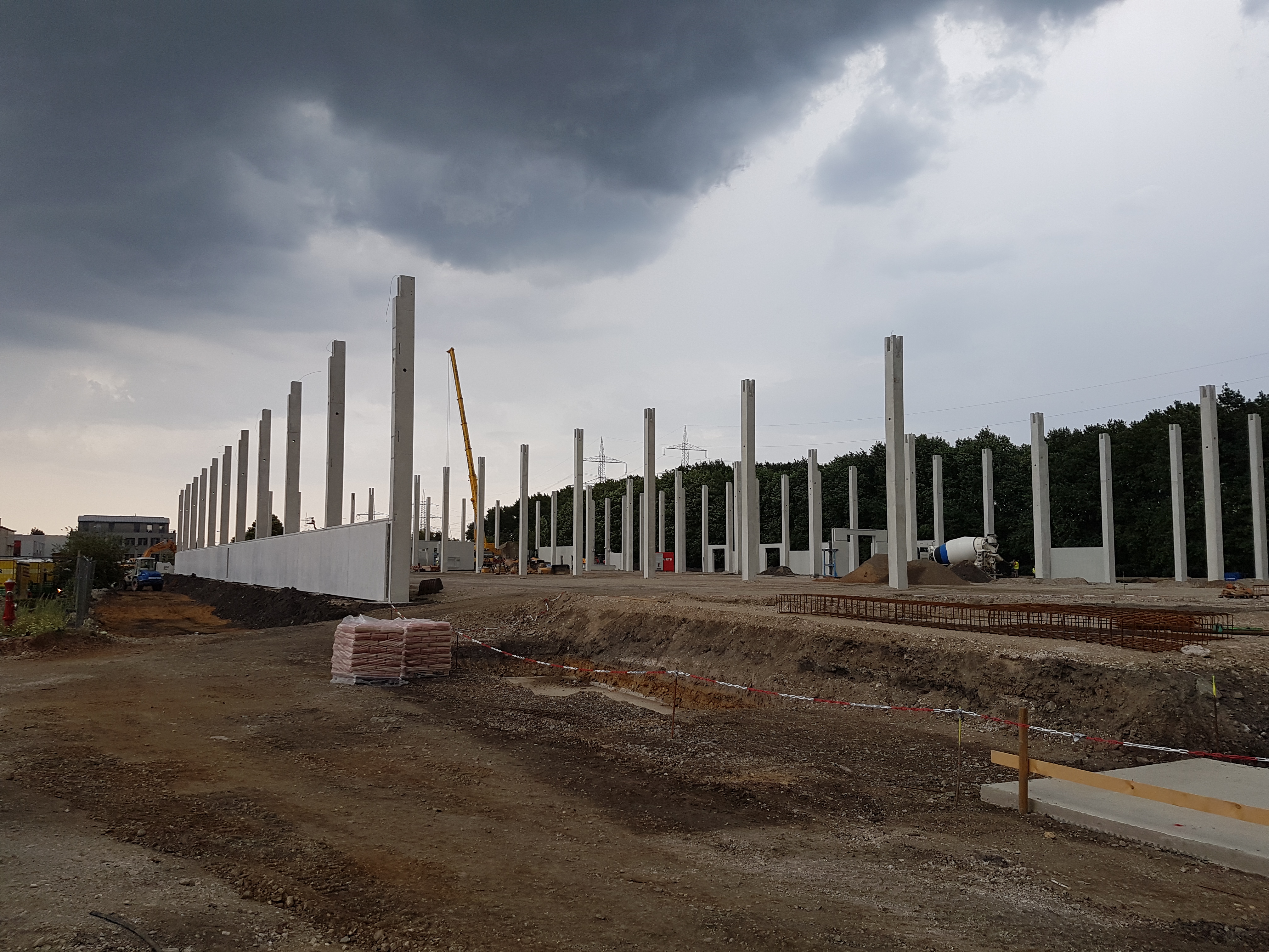 Der gut 13.000 m² große Neubau besteht aus 3 Hallen, die durch Brandwände voneinander getrennt sind. .