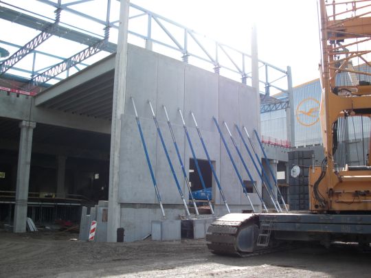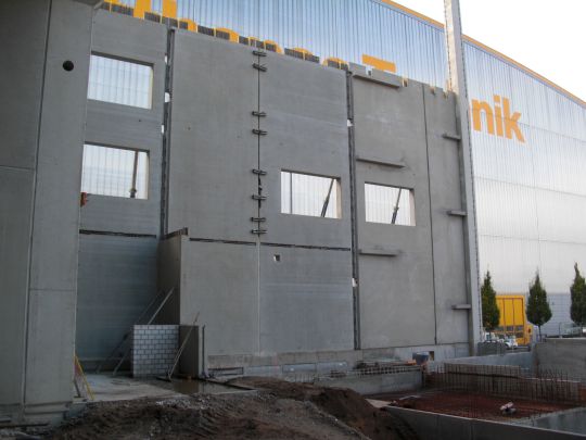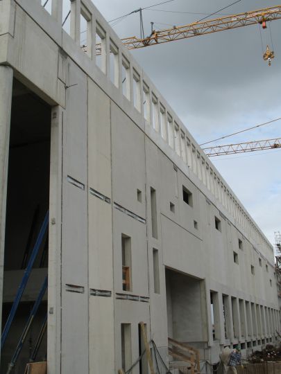 Aus Platz- und Termingründen wurde die Reihenfolge geändert: Der Gittermastkran stand auf Kote 10 m im Inneren der Baugrube, die Fertigteildecke (Kote+/-0 m) wurde vorgezogen und zur Gebäudeaussteifung herangezogen. Der Kellerboden und die Kellerdecke (Kote -5 m) wurden nach der Fertigteilmontage eingebracht.