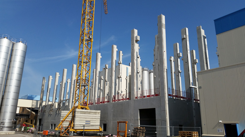 Das Produktionsgebäude der Molkerei frischli hat eine Grundfläche von ca. 20 m x 64 m und eine Höhe von 45 m. Die Konstruktion wurde unter Berücksichtigung der beengten Platzverhältnisse, der vorgegebenen Termine und der BE in der Angebotsphase gemeinsam mit dem Generalunternehmen als unterstützungsfreie Fertigteilkonstruktion entwickelt.
