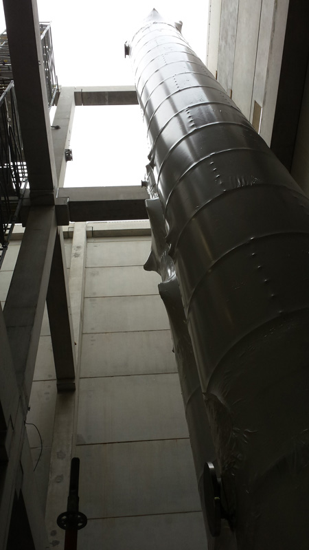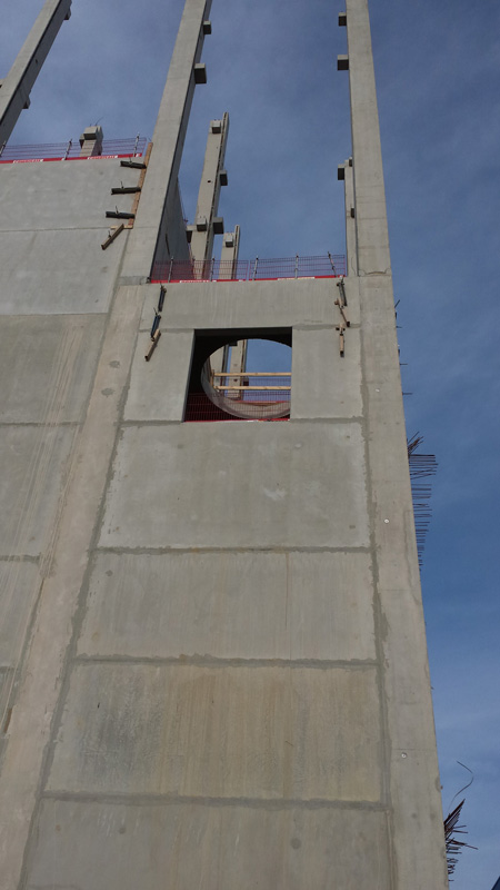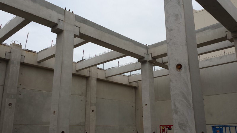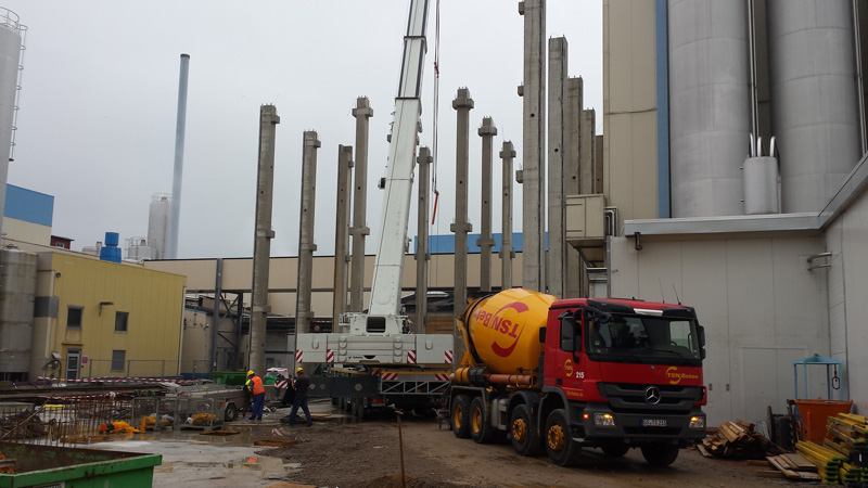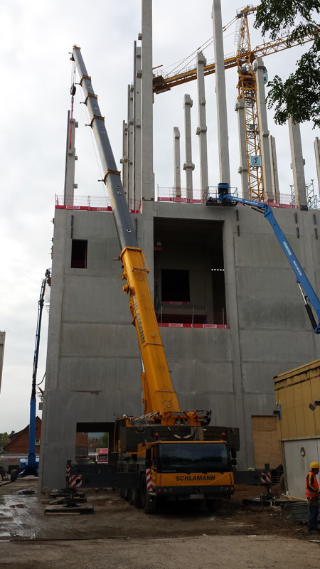 Die Fertigteilmontage erfolgte bis auf die Stützen mit dem Hochbaukran. Aus Gewichtsgründen wurden die Stützen zwei– oder dreigeteilt, mit dem Autokran montiert und kraftschlüssig verbunden.