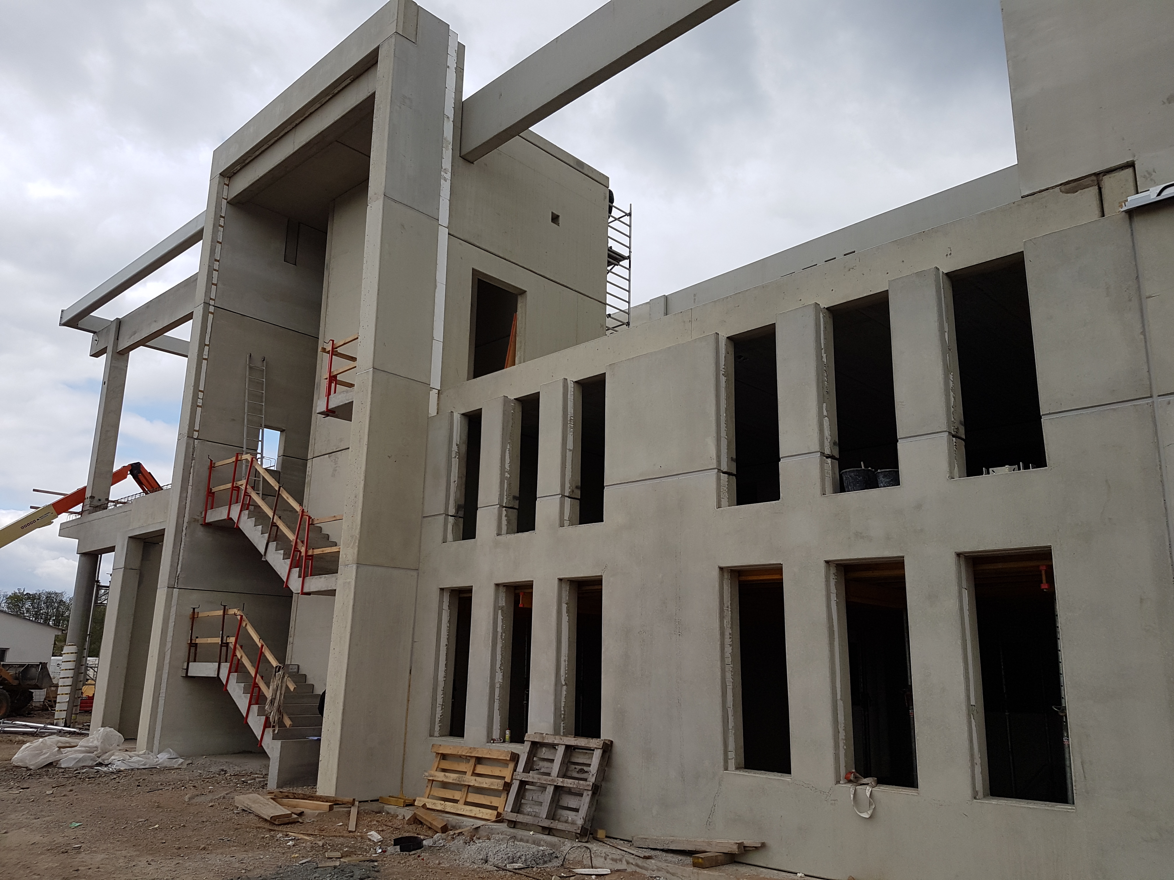 - Konstruktion des Kopfbaus mit Fertigteilen, Halbfertigteilen, Spannbetonhohldielen, Ortbeton und Stahlbau